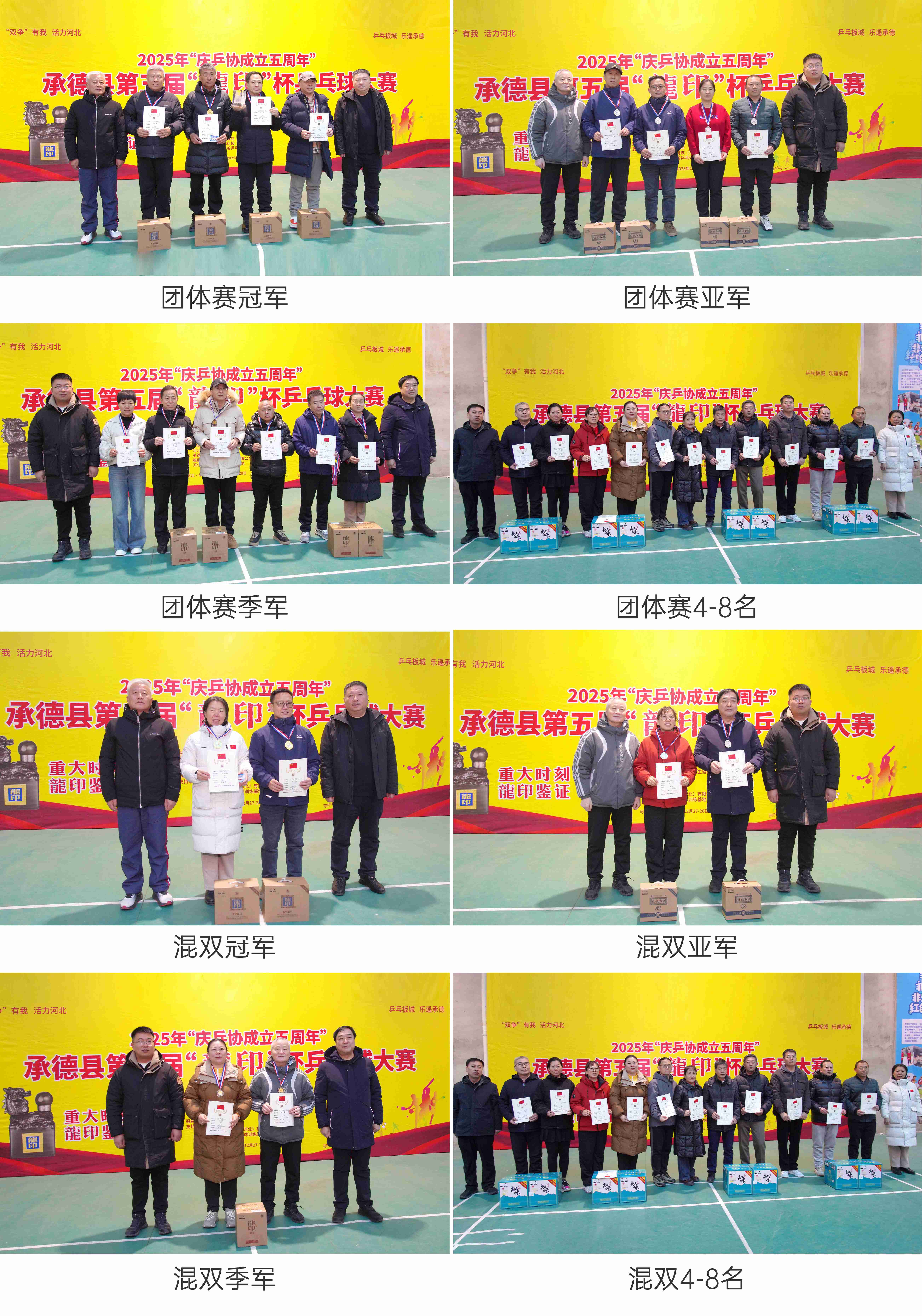 12月27日至28日,2025年“慶乒協成立五周年”承德縣第五屆“龍印杯”乒乓球大賽圓滿落幕。本次賽事由承德縣教育和體育局、承德縣旅游和文化廣電局聯合主辦;承德縣體育總會、承德縣乒乓球運動協會承辦;承德縣民政局、承德縣衛生健康局、承德縣融媒體中心協辦;板城酒業連續五屆獨家冠名支持。